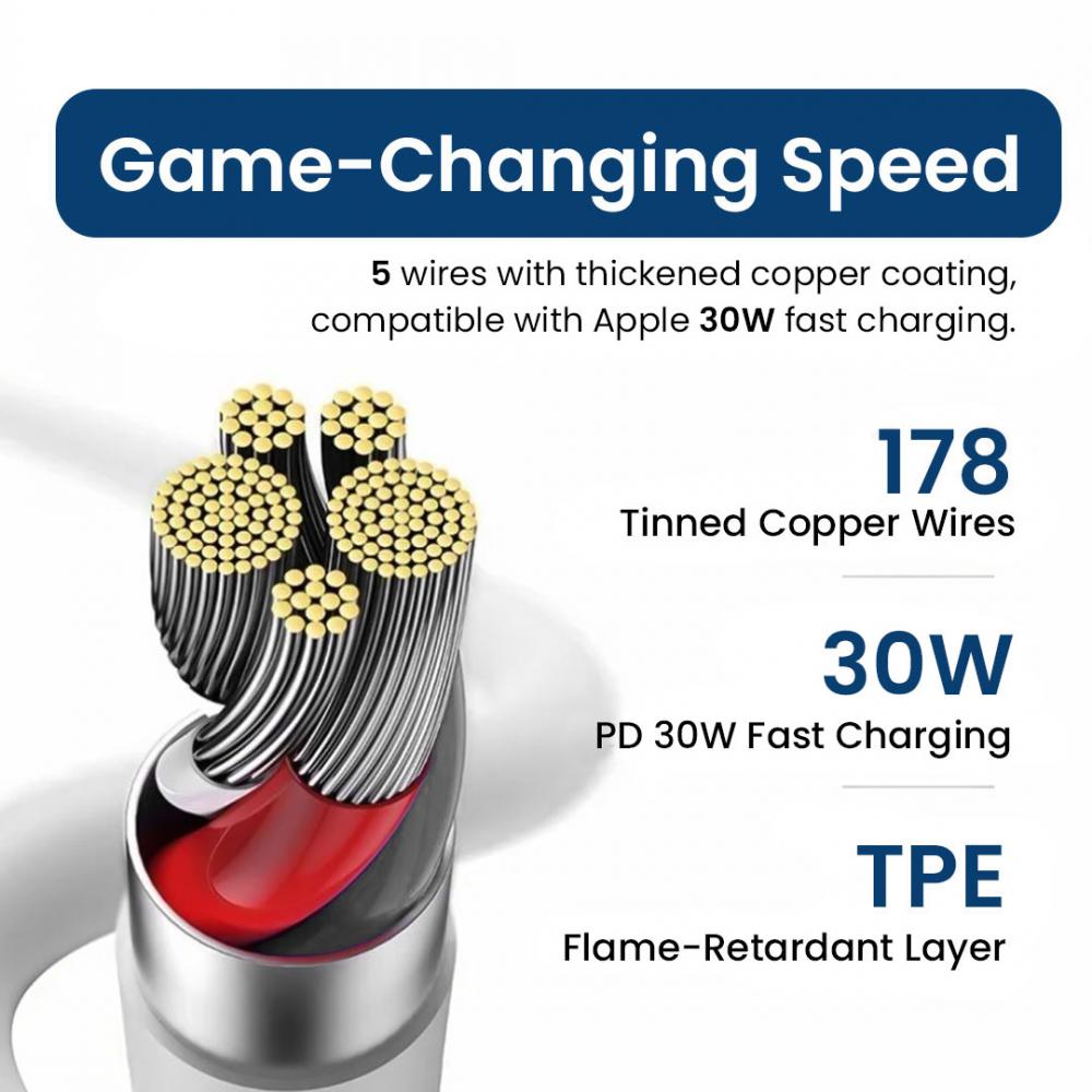This high-performance USB-C to 8 Pin cable is designed for your Apple devices and features a built-in smart chip that supports USB Power Delivery (PD) fast charging. Charge your iPhone 16 Pro Max up to 65% in just 30 minutes for quick and efficient power replenishment.